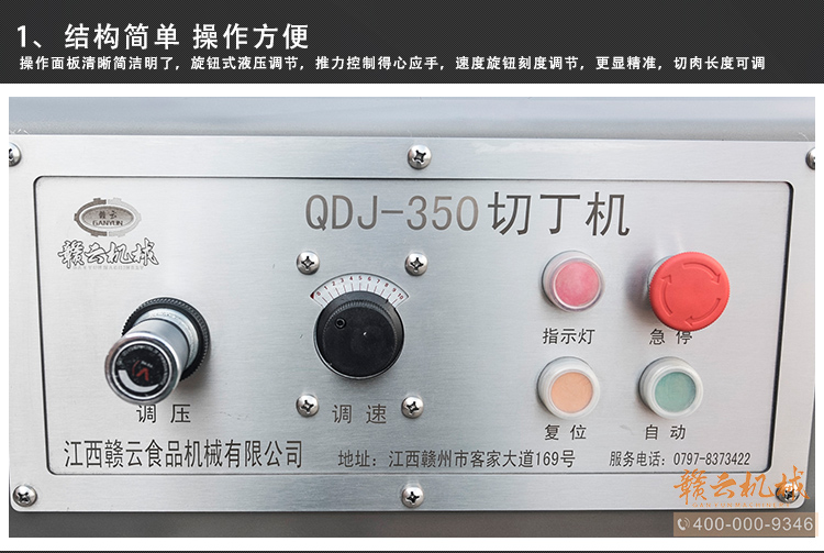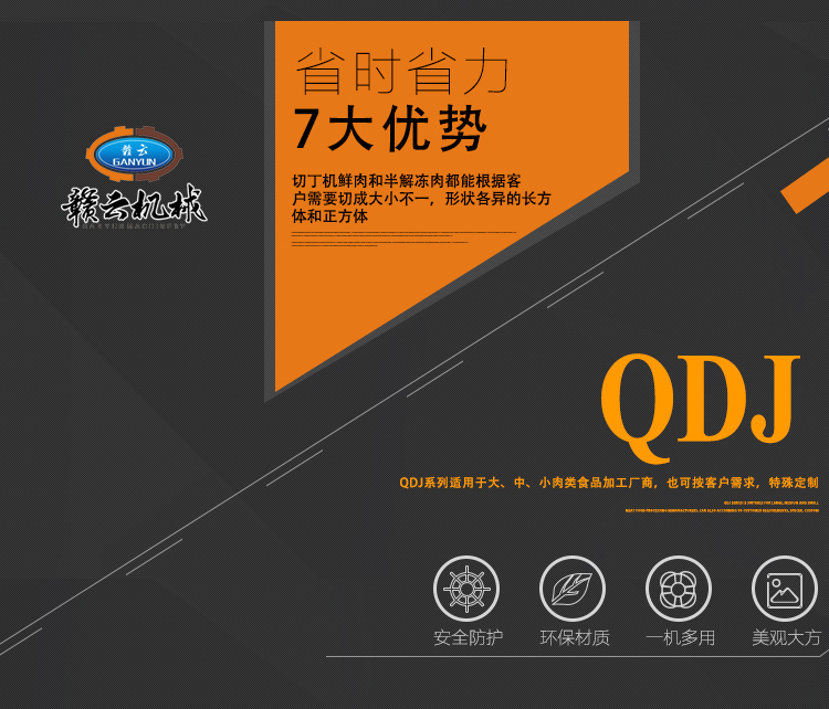 本設備采用全304不銹鋼構架,高級噴砂處理,激光雕刻,利用液壓推料設計,步進式進料,全自動切割,配合日本原裝進口刀具,鋒利切割,速度快,切割長度可調,寬度規格可定制,并配備安全感應雙保護設置,整體外形美觀大氣,是肉類食品加工專用切丁設備。
