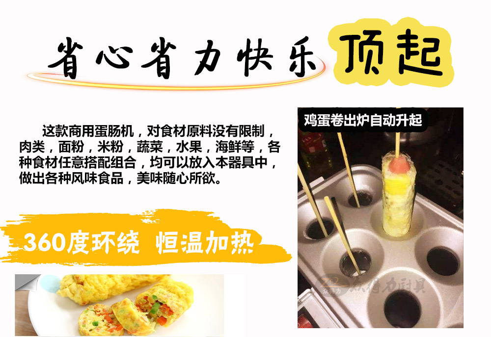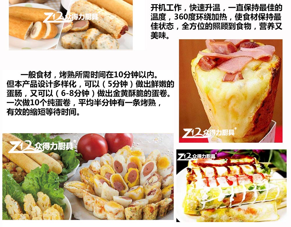 燃氣蛋腸機,電熱蛋腸機,快速升溫,360度環繞加熱,5分鐘即可做出鮮嫩的蛋腸,一次做十個蛋卷,平均每半分鐘即可烤熟一根,有效縮短等待時間,提高產品銷售額,蛋腸蛋卷美味吸引過往人群,小吃致富首選小設備,操作簡單。眾得力廚具,給我一個空間,服務一輩子。