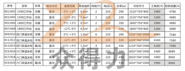 冷藏冷凍柜系列產品技術參數及統一報價: