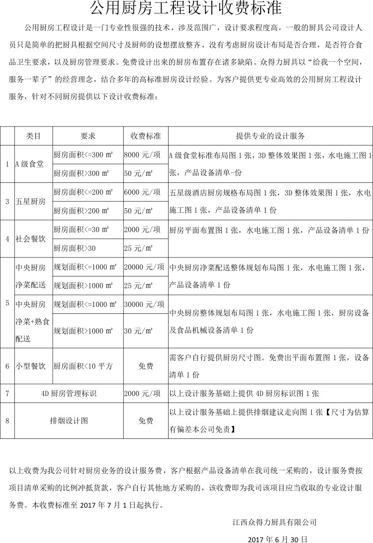 以上設(shè)計收費,客戶可自行其他公司統(tǒng)一采購,凡廚房設(shè)備清單在我公司一站式采購的,設(shè)計服務(wù)費可按比例抵扣貨款。在我司一站式采購廚房設(shè)備,即免以上設(shè)計服務(wù)費。